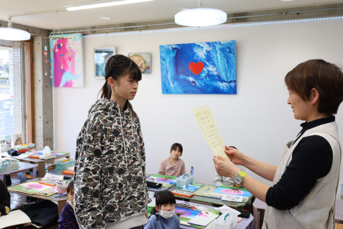 作品展で開催した部屋に飾りたい絵コンテストの受賞者さんに個別表彰しています